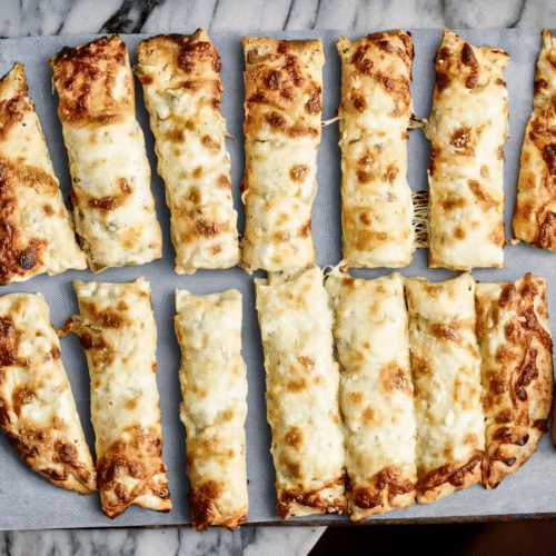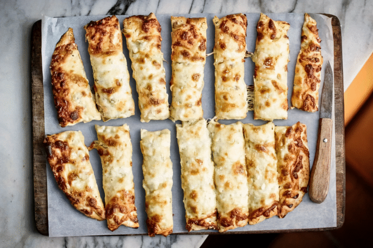 The key to these breadsticks is a simple, slightly sticky pizza-style dough that bakes up soft and chewy. There’s no complicated kneading involved; a stand mixer does most of the work. The dough is spread out right on the parchment paper it bakes on, which makes the whole process really straightforward. A generous layer of garlic butter and two kinds of cheese makes them savory and indulgent.
