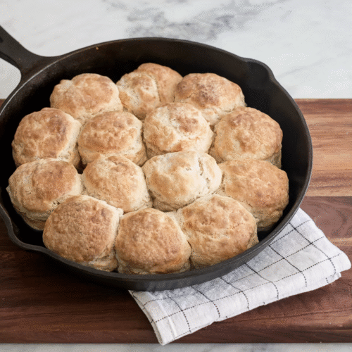 Arrange the biscuits so they are just touching in a large cast-iron skillet or a 9×13 inch baking dish. Gently press the leftover dough scraps together to cut out the remaining biscuits.
