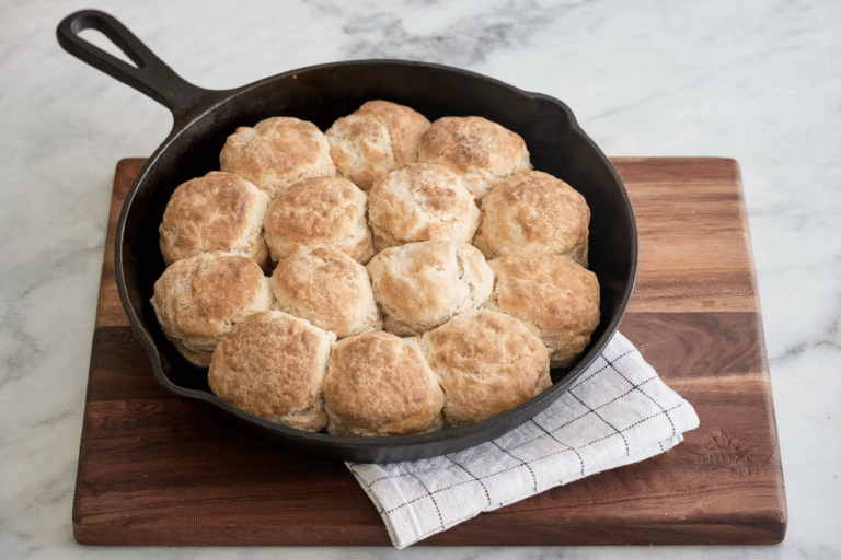 - Place biscuits touching in cast-iron skillet or 9×13 baking dish.