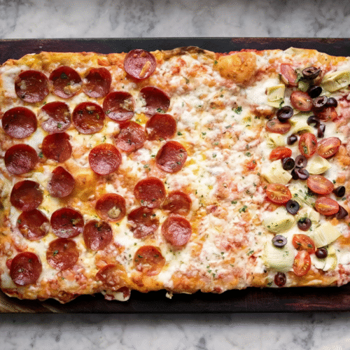 Carefully remove the pan from the oven. Top the par-baked crust with the shredded mozzarella and pepperoni, if you’re using it.