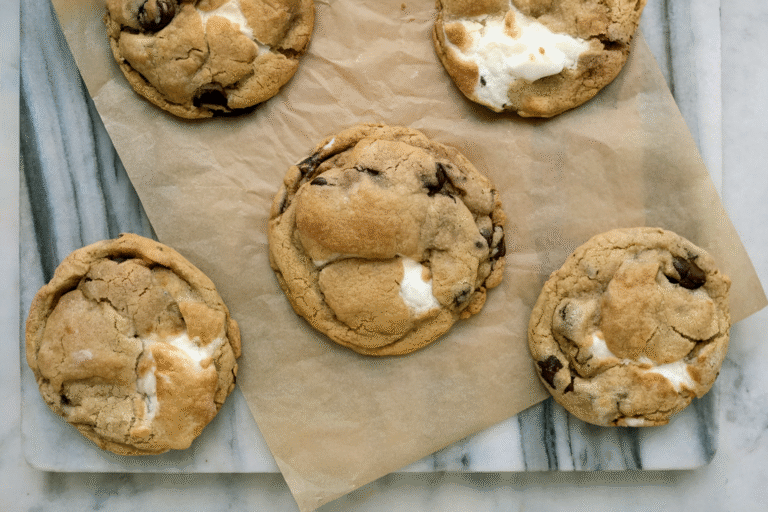 Let the cookies cool on the baking sheet for a few minutes before moving them. They’re best eaten while they’re still warm and the marshmallow is gooey.