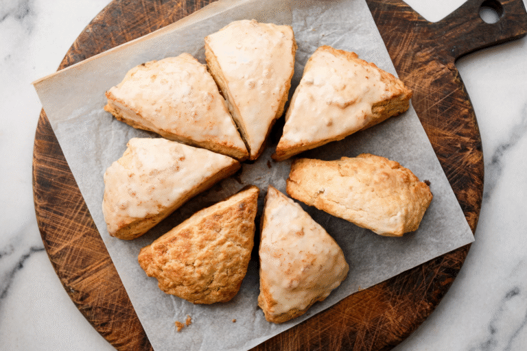 While the scones are still warm, whisk together the powdered sugar, maple syrup, and milk for the glaze. Drizzle it over the top and let it set before you serve them.